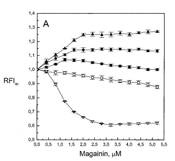 除上述相似性外,當(dāng)使用芘標(biāo)記的脂質(zhì)類似物研究酸性磷脂對(duì)脂質(zhì)動(dòng)力學(xué)的影響時(shí),兩種肽之間也存在明顯差異。Magainin 2導(dǎo)致兩性磷脂組成的LUV的芘發(fā)射顯著猝滅(圖2A)。然而,在PG存在的情況下,芘的單體強(qiáng)度增加,XPG逐漸增加了這種效應(yīng)的幅度(圖2A)。圓二色性、拉曼光譜、傅里葉變換紅外光譜和固態(tài)核磁共振研究表明,馬蓋寧在與脂質(zhì)雙層結(jié)合時(shí)采用螺旋構(gòu)象(Matsuzaki等人,1989年、1991年;Williams等人,1990年;Jackson等人,1992年;Bechinger等人,1993年;Wieprecht等人,1997年;Hirsh等人,1996年)。magainin 2對(duì)兩種膜的這些不同影響可能是由于1)通過(guò)與肽的帶正電基團(tuán)(例如賴氨酸的?氨基)直接接觸使芘熒光猝滅,或2)插入雙層的=-螺旋肽改變熒光團(tuán)的微環(huán)境,與層平面平行,如上所述。然而,在PG存在的情況下,肽的正電荷應(yīng)在與酸性磷脂形成靜電復(fù)合物時(shí)被中和,從而減少由于π-陽(yáng)離子相互作用導(dǎo)致的芘熒光猝滅。