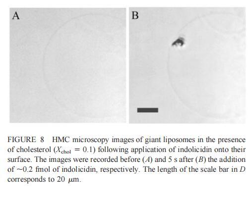 隨后,我們研究了吲哚西丁對(duì)由SOPC和膽固醇組成的巨大脂質(zhì)體(Xchol?0.1)的影響。吲哚西丁在膽固醇存在的情況下也會(huì)引起巨大脂質(zhì)體的起泡。形成的內(nèi)吞小泡在巨大小泡的表面上深度聚集(圖8b)。具體地說(shuō),在添加約0.2 fmol吲哚西啶(~400 fl,20次注射,圖8 B)后約5 s內(nèi),巨大脂質(zhì)體表面出現(xiàn)一簇小顆粒。隨后,聚集物轉(zhuǎn)移到巨大的脂質(zhì)體中,同時(shí)也有少量?jī)?nèi)吞顆粒(θ≈0.9米)處可見(jiàn)。進(jìn)一步添加吲哚西丁會(huì)增加這些顆粒的數(shù)量,并導(dǎo)致巨大脂質(zhì)體收縮。然而,即使在暴露于~2 fmol吲哚西丁(200次注射,數(shù)據(jù)未顯示)的情況下,膜大體上仍保持完整。