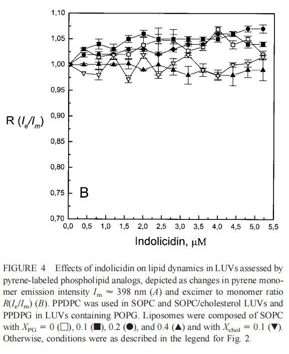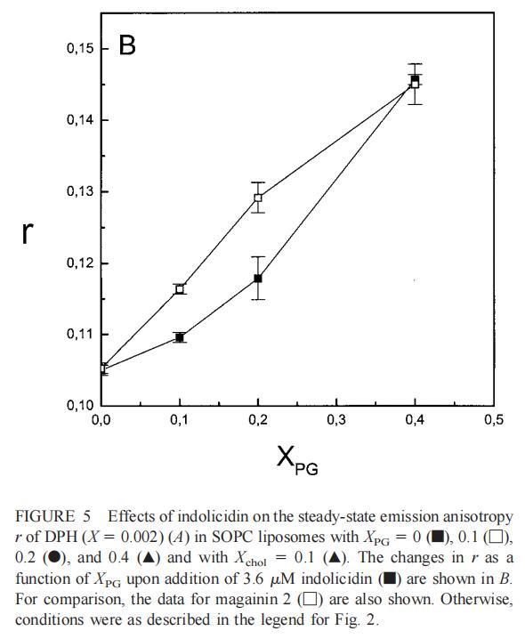 雖然熒光光譜顯示,馬蓋寧2和吲哚西啶對(duì)脂質(zhì)動(dòng)力學(xué)的影響存在明顯差異,但也存在一些明顯的相似之處。因此,DPH各向異性r的增加表明,在存在酸性磷脂的情況下,這兩種肽都會(huì)導(dǎo)致酰基鏈順序的增加,這種影響的程度隨著XPG的增加而增加(圖3b和5b)。同樣,在膽固醇存在的情況下,兩種肽對(duì)芘熒光的有效猝滅也很明顯(圖2a和4a)。這可能與膽固醇的OH基團(tuán)和馬蓋寧的E19殘基之間的相互作用有關(guān)(Tytler等人,1995年),該肽在膜中具有跨膜取向。當(dāng)Xchol=0.1時(shí),r值的增加是由于吲哚西丁所致,而馬加寧則無(wú)影響。這表明,在膽固醇存在的情況下,吲哚肽可能采用跨雙層取向,其長(zhǎng)軸垂直于雙層平面。