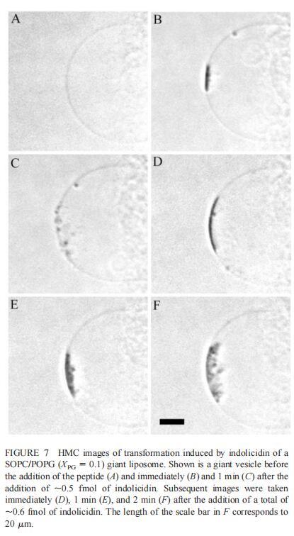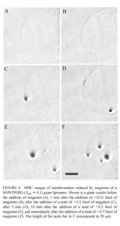 由于上述magainin 2和吲哚西啶對(duì)單層和LUV具有明顯的脂質(zhì)成分依賴性作用,因此有興趣使用巨型脂質(zhì)體比較這些肽對(duì)宏觀膜的三維拓?fù)浣Y(jié)構(gòu)的影響,無(wú)論是否含有PG,都可以在交流電場(chǎng)中形成由SOPC組成的巨大脂質(zhì)體。即使暴露于大量肽(~2 fmol,~4 pl=200次重復(fù)注射,數(shù)據(jù)未顯示),SOPC膜也不受magainin 2的影響。同樣,由SOPC和膽固醇(Xchol=0.1)組成的巨大脂質(zhì)體也不受此量的馬蓋寧2的影響(數(shù)據(jù)未顯示)。然而,在存在POPG(XPG=0.1)的情況下,已經(jīng)~0.01 fmol(單次~20 fl注射)的magainin 2應(yīng)用于巨大囊泡表面,顯著影響巨大脂質(zhì)體膜的拓?fù)浣Y(jié)構(gòu)(圖6 B)。更具體地說(shuō),在~1分鐘內(nèi),小顆粒(θ≈0.9米)出現(xiàn)在巨大的囊泡內(nèi)。隨后注射高達(dá)~0.1 fmol(約200 fl)的magainin 2不會(huì)引起進(jìn)一步的可見(jiàn)變化。在總共添加約0.2 fmol的肽后,膜開(kāi)始起伏,形成致密顆粒(θ≈4 m)在巨大脂質(zhì)體內(nèi)可見(jiàn)(圖6 C)。在~5分鐘內(nèi),幾個(gè)小顆粒(θ≈0.9 m)出現(xiàn)在巨大脂質(zhì)體膜的內(nèi)表面(圖6 D)。隨后,大多數(shù)小顆粒進(jìn)入巨大囊泡的內(nèi)腔。這些內(nèi)吞小泡似乎在巨大脂質(zhì)體內(nèi)自由移動(dòng),在隨后30分鐘的觀察中沒(méi)有進(jìn)一步的變化。進(jìn)一步注射magainin 2,提供總共0.3 fmol的肽,引起類似內(nèi)吞作用的過(guò)程,出現(xiàn)直徑約8 m的致密顆粒(圖6 E)。約10分鐘后,巨大脂質(zhì)體內(nèi)約0.9-m顆粒的數(shù)量繼續(xù)增加。偶爾,這些顆粒也出現(xiàn)在巨大囊泡的外表面,并釋放到外部緩沖液中(圖6 E)。隨后添加magainin 2(~0.7 fmol)使膜不穩(wěn)定并誘導(dǎo)進(jìn)一步的囊泡形成(圖6 F)。這些內(nèi)吞囊泡在巨大脂質(zhì)體內(nèi)彼此分離,巨大囊泡的大小明顯減小(圖6f)。最終,在進(jìn)一步添加magainin 2(高達(dá)~1.5 fmol)后,巨大的脂質(zhì)體膜崩塌。上述形態(tài)學(xué)變化具有高度的可重復(fù)性。