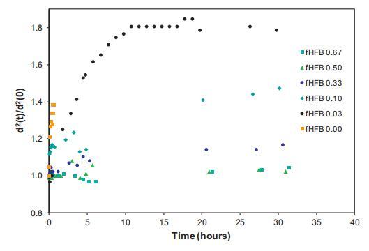 對于0.03<fHFBII<0.2的泡沫中氣泡尺寸的增加,觀察到在初始粗化數(shù)小時后,曲線趨于平穩(wěn)。在粗化過程中,小氣泡的收縮和總氣泡中較大氣泡的增長導(dǎo)致泡沫總表面積的凈減少。上述結(jié)果表明,氣泡穩(wěn)定性隨著表面積的逐漸減小而增加,這與朗繆爾槽上吸附系統(tǒng)在大變形壓縮/膨脹循環(huán)中觀察到的行為一致。