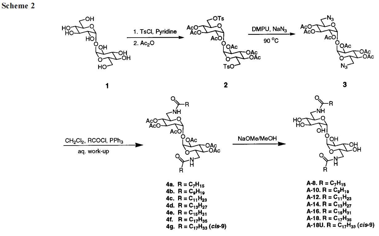 2,3,4,2′,3′,4′-六鄰乙酰基-6,6′-二十八胺基-6,6′-二脫氧-r,r-D-海藻糖,4a。按照上述一般程序,2.1 g(3.3 mmol,6.5 mmol當量)3,50 mL CH2Cl2和2.7 mL(9.8 mmol)辛酰氯,以及2.4 g(9.2 mmol)PPh3與15 mL CH2-Cl2反應。黑色固體被過濾,留下栗色溶液。洗滌和干燥后,對所得棕色糖漿進行色譜分析,得到2.2 g(80%)4a,白色固體,mp 70-72°C。