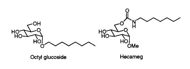 我們的第一個驚喜是發現A系列海藻糖雙子座不溶于水。例如,A-12、A-14和A-16(指鏈長的數字)在1毫升溫水中旋轉2毫克時會留下沉淀物。即使在70°C的溫度下,A-10也會在這種處理過程中形成渾濁的懸浮液。A-8在室溫下的可溶濃度僅為1-2 mM(根據動態光散射,在該濃度下,會形成膠束大小的聚集體)。天真地說,人們可能會認為a-8的溶解度大得多,因為該分子由六個羥基和兩個酰胺組成。盡管相關的6-氨基-6-脫氧己糖衍生物需要加熱才能溶解,25許多烷基化單糖(例如,辛基葡萄糖苷和甲基6-O-(N-庚基羰基)-R-D-吡喃葡萄糖苷或下面的“Hecameg”)是水溶性的。然而,A-8并沒有類似的天賦。這里的教訓是,用一句老生常談的話來說,我們的雙子座比其各個部分的總和要多(或少)。不管老生常談與否,雙子座的獨特屬性都取決于它。