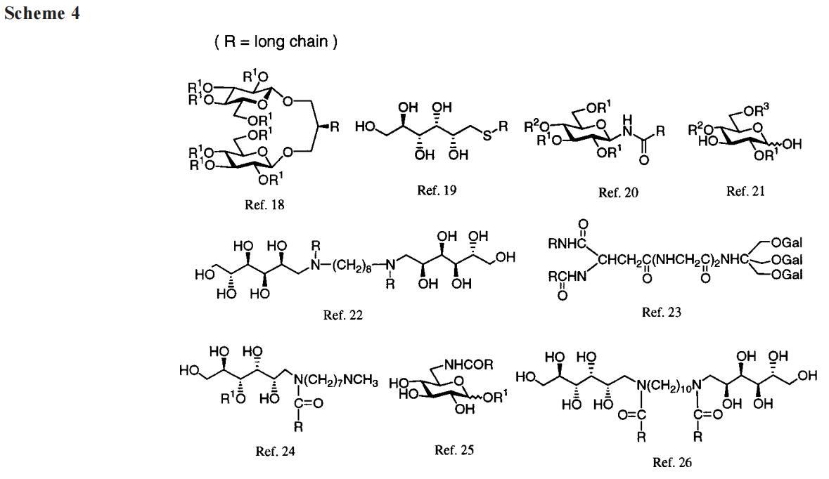 迄今為止的總結是:A系列海藻糖雙子,對于10或更長的鏈不溶于水,形成單分子膜,其界面區域主要由糖間隔基控制。分子間的鏈/鏈相互作用穩定了薄膜。A-8在水中形成小膠束,而水合后,更高的同系物聚集成泡狀和管狀結構,在光學顯微鏡下可見。水化性質與凝膠到液晶的轉變相一致,事實上,轉變溫度可以通過量熱法確定。因此,海藻糖雙子的行為與磷脂和合成雙鏈表面活性劑的行為相似。17,37就好像海藻糖不是雙子座的間隔物,而是一個特別大但傳統的頭群。