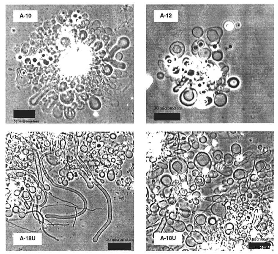 圖2。A-10(左上)、A-12(右上)和A-18U(下)在23°C下水合3-4小時后形成的囊泡和管狀結構的相襯顯微照片。在45°C下培養的A-14和A-16樣品中觀察到類似結構。