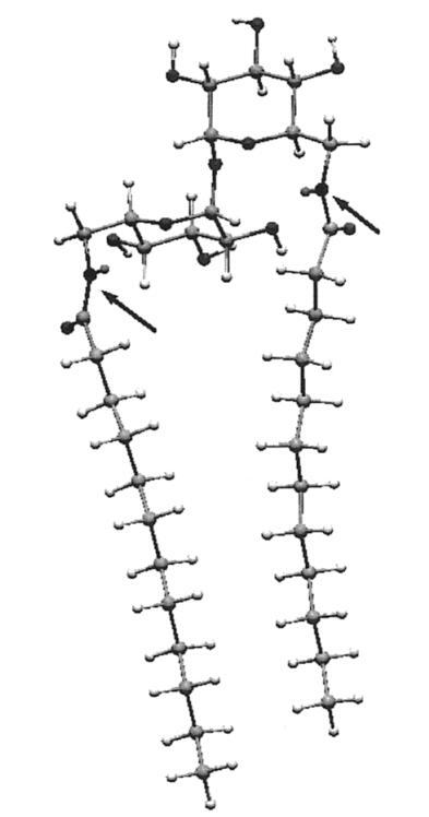 計算首先將海藻糖插入宏模型程序42,并對結構進行琥珀色能量最小化。從使用琥珀色*力場的25000個構象搜索中,我們選擇了能量最低的構象,該構象恰好與報告的X射線結構重疊。43,44接下來,該結構中的6-和6′-羥基被乙酰氨基取代。在模擬的水環境中,用AMBER*再次進行了25000次構象搜索。然后乙酰基被十二烷基取代,然后對生成的a-12雙子座進行了另一次搜索。結果表明,整個構象由酰胺羰基和相鄰葡萄糖環的2-羥基之間的兩個分子內氫鍵控制。氫鍵導致兩條全反式鏈彼此擺動約95°。A-12的固態紅外光譜證實了這種相互作用,該光譜顯示1646 cm-1處有羰基帶,而Hecameg的羰基帶為1700 cm-1,單體葡萄糖類似物的羰基帶為1698 cm-1。25由于這種構象會不切實際地排除分子內疏水締合,而且在任何情況下,羰基氫鍵位點的溶劑可能會淹沒在水中,我們故意不允許-CdO氫鍵,并重新計算。通過這種方式,我們得到了圖6??梢钥吹?,一條鏈上大約有八個碳與其伙伴鏈的碳并排排列。N/N距離僅為7.4?,整體分子形狀為“管狀”。用另一種方式說,糖的頭基延伸的距離不比兩條鏈的寬度大多少,就像人們預期的一種易于堆積成雙層的化合物那樣。45因此,正如前面從實驗數據得出的結論,海藻糖更像是一個統一的頭基,而不是一個可以有效隔離鏈的長間隔基。