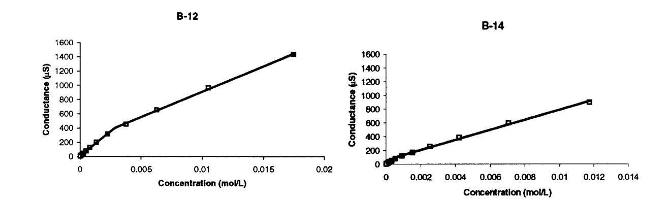 圖5。圖中給出了B-12和B-14臨界膠束濃度,該濃度由電導-濃度曲線中的斷裂點確定。每個點代表23°C下的單個電極讀數。