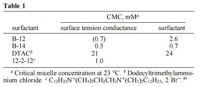 B-12和B-14確實是水溶性化合物,在臨界膠束濃度(CMC)以上形成膠束,動態光散射顯示顆粒大小小于5nm。CMC值是通過表面張力-濃度曲線(圖4)和電導率-濃度曲線(圖5)中的斷裂來確定的。38表1給出了結果數據(以及兩種常規表面活性劑的數據,用于比較)。如圖所示,B-12的CMC值通過張力測量法和電導測量法(這兩種方法都是可重復的)得出的結果不一致。這種差異至少部分可以追溯到B-12表面張力的時間依賴性。因此,在10分鐘的過程中,B-12水溶液的表面壓力增加了10 mN/m,之后趨于穩定。這種動態表面張力過程(之前已經用雙子座表面活性劑觀察到)13,15,39可能與雙子座表面活性劑在空氣/水界面組織方面的困難有關。為了解決這個問題,圖4中的B-12溶液在表面張力測量之前老化20分鐘,從而減少了系統尚未平衡的可能性。盡管采取了這種預防措施,但我們無法確定依賴時間的界面重組是否不會影響B-12圖,并導致基于張量和電導的數據之間的差異。當然,后者來源于不受界面事件影響的大塊特性,因此更可靠。有趣的是,B-14沒有表現出隨時間變化的表面張力,兩種方法確定的CMC值是合理一致的。也許更長的鏈既增強了對空氣/水界面的親和力,也增強了從溶液中吸收界面的動力學。