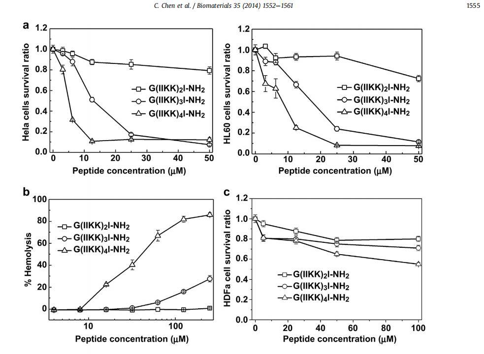 開發(fā)對宿主細(xì)胞具有良好生物相容性但對癌細(xì)胞具有高效力的功能性生物材料和藥物是一項具有挑戰(zhàn)性的工作。通過利用天然抗菌肽和a-螺旋蛋白的優(yōu)勢特性,我們設(shè)計了一類新的短a-螺旋肽G(IIKK)nI-NH2(n細(xì)胞)。我們表明,含有?n1e4的肽具有不同的效力和對癌癥?3和4的高選擇性,能夠有效殺死癌細(xì)胞,同時在其工作濃度下對宿主細(xì)胞保持良性,通過類似于殺菌效果的機械過程。細(xì)胞的高選擇性可能源于它們優(yōu)先與帶有負(fù)電荷和高流動性的細(xì)胞外膜結(jié)合。除了快速透膜能力外,這些肽還可以通過線粒體途徑和死亡受體途徑誘導(dǎo)癌細(xì)胞的程序性細(xì)胞死亡,而不會誘導(dǎo)非特異性免疫原性反應(yīng)。重要的是,這些肽還可以在小鼠異種移植模型中抑制腫瘤生長,而不會引起副作用。雖然這項研究揭示了這些肽作為強效藥物和其他醫(yī)療保健應(yīng)用的臨床潛力,但它也指出了基礎(chǔ)材料研究在高選擇性肽功能材料未來發(fā)展中的重要性。