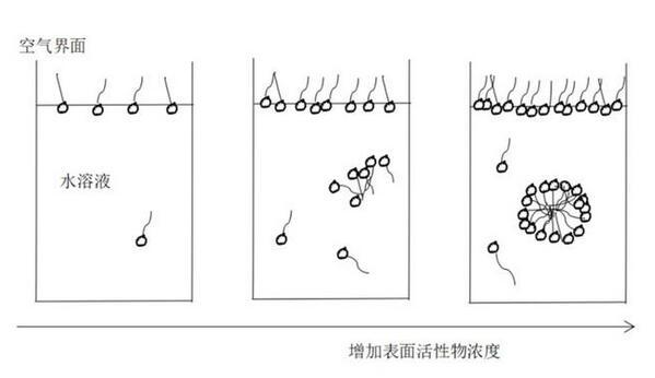 我們在文章開頭介紹過,表面活性劑是一種兩親的分子,一頭親水一頭親油。因此,低濃度時表面活性劑傾向于留在水的表面,親油(厭水)的一頭朝外,首先布滿水面,也就是水-空氣界面,所以會降低這個界面的張力。