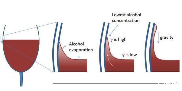 瑪拉高尼效應不光存在于物理實驗和我們之前開的玩笑之中,在我們的日常生活中也有馬拉高尼效應的體現,這一現象可能每一個人都見過,那么就是我們在喝酒的過程中看到的所謂的好酒會掛壁的現象。就算再好的酒,它也是有水在其中的。好酒中的酒精由于毛細效應爬到高處的時候,酒精蒸發,使得處于上層的酒液的酒精含量相比較于下層來說要低,而同時的酒的表面張力要比水小,兩種液體表面張力的差距就形成了馬拉高尼效應。
