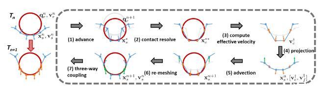 我們的耦合系統(tǒng)分為三個(gè)部分:流體,表面層,固體。流體部分我們采用傳統(tǒng)的歐拉網(wǎng)格的模擬方法,在交錯(cuò)網(wǎng)格(Staggered Grid)上用算符分離的方法求解離散不可壓的Navier Stokes方程。固體部分采用傳統(tǒng)的拉格朗日方法求解牛頓方程。我們的主要貢獻(xiàn)在于在流體與固體之間插入了一層有質(zhì)量、有厚度的流體表面層,這個(gè)表面層直接對(duì)應(yīng)我們上面介紹的流體表面分子稀疏的部分。因?yàn)檫@個(gè)表面層非常薄,我們可以使用帶虛擬厚度的單層三角網(wǎng)格來表示,然后在這個(gè)表面層上施加表面張力勢(shì)能。為了將這三個(gè)部分耦合起來,我們?cè)诒砻鎸雍捅尘熬W(wǎng)格、固體和背景網(wǎng)格之間定義了速度的插值矩陣,同時(shí)將流體的壓強(qiáng)作用在表面層和固體上,以及將表面張力作用在固體上,這樣我們將這三部分寫進(jìn)一個(gè)三相耦合方程里進(jìn)行統(tǒng)一求解和更新。最終我們算法的流程如下: