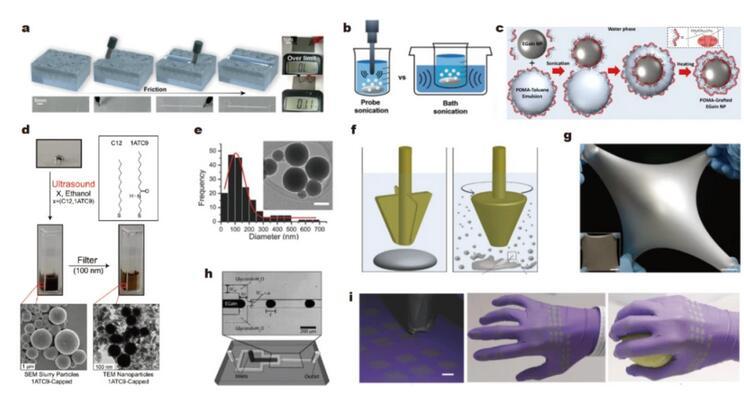 使用超聲和剪切等自上而下的方法將液態金屬從一個大的液滴分割成許多微米級或納米級的液滴,并保證其粒度分布相對均勻。氧化層或其他人工形成的表面修飾將暫時阻止液滴的重新結合。可拉伸電子設備的圖案可以通過排列這些液滴來繪制,這相當于通過減小粒徑以增加比表面積(增加氧化層比例)進而降低表面張力。