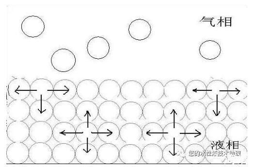 表面張力是因液體內部分子間的內聚力而產生的,表面分子由于受力不均衡而受到向內的作用力,與其它作用力形成平衡。原理示意如下: