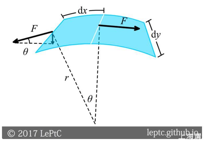 假設(shè)膜在x的方向彎曲,曲率半徑為r,作用在一個微小的長度dy上的表面張力F=σdy,sinθ≈dx/r,指向球內(nèi)的合力為Fsinθ=σdxdy/r(沒有乘2是因為每條邊的力被相鄰兩個面元共用),這一力由壓強(qiáng)差平衡,除以面積dxdy得壓強(qiáng)差為σ/r。對于球面x和y方向都彎,故球內(nèi)壓強(qiáng)比球外大2σ/r(對于肥皂泡因為有兩層界面還要再乘2)。
