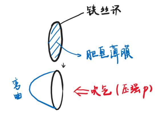 這時,咱們在一側吹氣(相當于施加了一個壓強),平整的薄膜就發生“彎曲”——