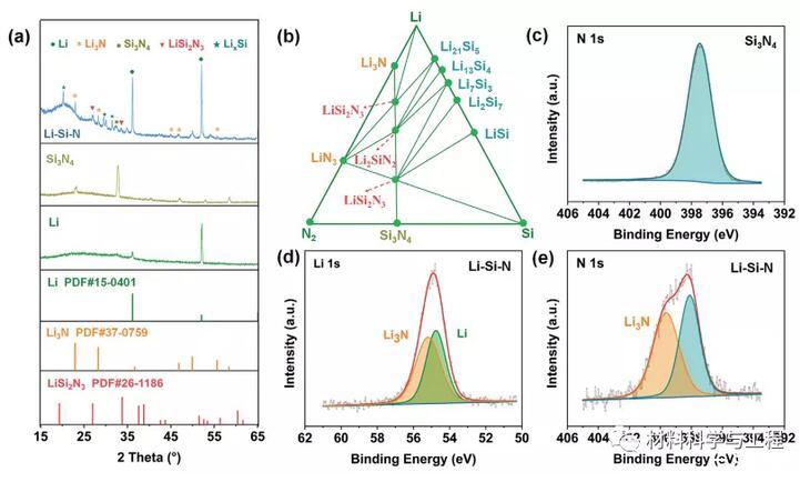 綜上所述,本文首次提出了用微量納米Si3N4(1wt%)調節(jié)熔融Li的表面張力來修飾Li|石榴石界面的實驗。從Li-Si-N系相圖出發(fā),結合XRD和XPS分析,發(fā)現(xiàn)當加熱1wt%Si3N4和Li金屬的混合物時,Li3N、LiSi2N3和LixSi顆粒的形成是一致的,生成的復合材料稱為Li-Si-N熔體。Li-Si-N熔體通過兩種方式極大地改善了與石榴石的界面接觸: