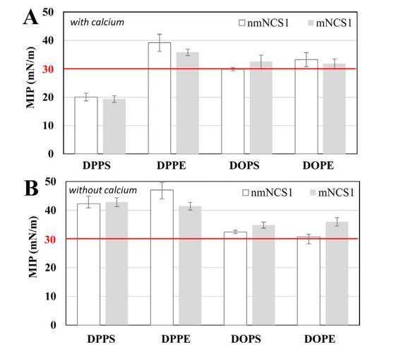 圖6比較了在有鈣和無鈣的情況下mNCS1和nmNCS1的MIP值(數(shù)值見表S5)。在鈣存在或不存在的情況下,用nmNCS1觀察到的MIP值與觀察到的四種磷脂的mNCS1的MIP值沒有顯著差異。因此,肉豆蔻酰基的存在似乎在鈣存在下蛋白質(zhì)的膜結(jié)合中不起關(guān)鍵作用。這些觀察結(jié)果表明,NCS1中不存在肉豆蔻酰鈣開關(guān)。事實上,另兩種非肉豆蔻?;腿舛罐Ⅴ;问降腘CS蛋白質(zhì)VILIP-1和VILIP-3的MIP值之間的巨大差異突顯了這種機(jī)制的存在[35]。在鈣與DOPC/DOPS單層(3:1)的存在下觀察到了這些差異。在不同的磷脂單分子膜中觀察到recoverin(另一種NCS蛋白質(zhì))的MIP值存在差異,無論是否具有肉豆蔻?;饔?,這些磷脂單分子膜突出了這種蛋白質(zhì)的肉豆蔻酰鈣開關(guān)(C.Salese,未發(fā)表的結(jié)果)。此外,肉豆蔻?;拇嬖谠黾恿薔CS1的鈣協(xié)同度[24]。事實上,mNCS1與鈣的結(jié)合比nmNCS1更強(qiáng),3個鈣離子與mNCS1結(jié)合,而nmNCS1只有2個。然而,這種區(qū)別不會導(dǎo)致鈣存在時nmNCS1的不同膜結(jié)合。