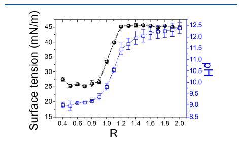 圖3.氫氧化膽堿/肉豆蔻酸分散體的表面張力(黑色圓圈)和pH(藍(lán)色正方形)隨25°C下摩爾比R的變化。