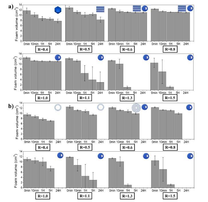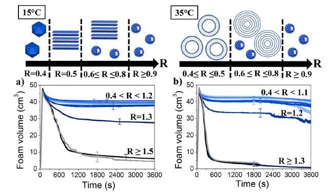圖5:在兩種溫度下(a)15°C和(b)35°C下,通過手搖動(dòng)不同摩爾比(R)產(chǎn)生的泡沫體積隨時(shí)間的變化。示意圖表示作為R和溫度的函數(shù)的大量自組裝體。