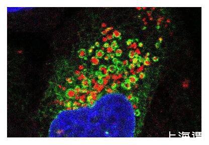 熒光顯微圖像顯示了內質網(綠色)像毯子一樣包裹住受損的溶酶體(紅色),細胞核以藍色顯示。