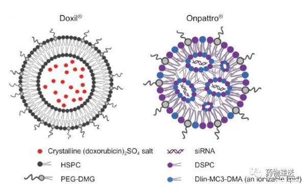 在組成方面,主要成分大致相同,都含有脂質和膽固醇,只是脂質納米粒所用的脂質中必須要有可電離脂質,而脂質體對脂質的種類沒有嚴格要求。但在各成分的比例方面,脂質體和脂質納米粒存在較大差異,尤其是膽固醇的用量,以經典的脂質體產品DOXIL為例,HSPC:CHOL:DSPE-PEG2000=3:1:1;而已上市兩款mRNA新冠疫苗的組分中,膽固醇分別占比42.7%(Pfizer/BioNTech)和38.5%(Moderna),明顯高于脂質體中膽固醇的含量。