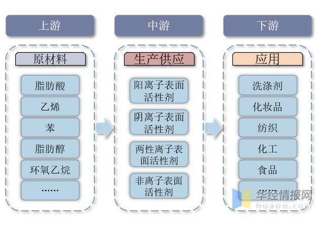 表面活性劑行業(yè)產(chǎn)業(yè)鏈上游主要為脂肪酸、乙烯、苯、脂肪醇、環(huán)氧乙烷等原材料;中游為表面活性劑生產(chǎn)供應環(huán)節(jié),主要包括離子和非離子表面活性劑;下游主要應用于洗滌劑、化妝品、紡織、化工、食品等領(lǐng)域。