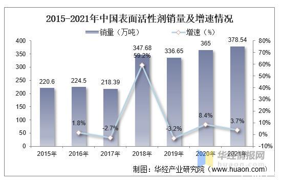 2015-2021年中國表面活性劑產(chǎn)量及增速情況