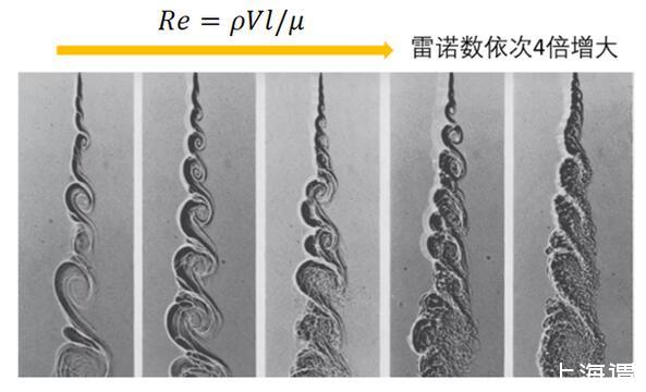 隨著雷諾實驗和雷諾數(shù)被提出來以后,近代流體力學,尤其是湍流理論的發(fā)展出現(xiàn)了一個前所未有的盛況,而粘性與湍流的關系也順理成章的轉(zhuǎn)化成了雷諾數(shù)和湍流的關系。1974年刊登于《流體力學》期刊中的一篇經(jīng)典文章,通過流動顯示技術生動形象的描繪了雷諾數(shù)和流態(tài)的關系:隨著雷諾數(shù)的增大,渦旋的整體形狀和尺度基本一致,然而射流摻混的渦系結(jié)構(gòu)卻越來越豐富。