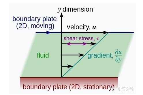 在這張圖中,下方的平板和兩個平板間的液體保持相對靜止,且液體內部沒有對自身體內不同質點的相對流動,而將上方平板做水平向右的推動。可以看見,在與上方平板直接接觸的一層液面處可以達到與被推動的平板相同的速度,而在垂直距離上越遠離上層平板的部分的速度越慢,直到最下層與下方平板直接接觸的液面處速度為零,在兩個平板之間存在一個連續變化的速度分布。