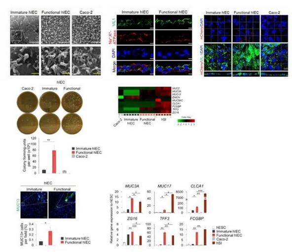由于在hSI中,Wnt的抑制和Notch的激活有助于祖細(xì)胞分化為吸收前上皮細(xì)胞,研究者使用了Wnt信號(hào)抑制劑Wnt-c59和Notch信號(hào)激動(dòng)劑丙戊酸(VPA),來進(jìn)一步將hIEC祖細(xì)胞分化為與體內(nèi)類似的成熟且有功能的hIEC。與其他僅由吸收性腸細(xì)胞組成的小腸上皮模型相比,該系統(tǒng)可以模擬體內(nèi)樣腸組織進(jìn)行研究。與未成熟的hIECs相比,功能性hIECs形成了一個(gè)結(jié)構(gòu)極化的單層,并觀察到了類似杯狀細(xì)胞分泌出的粘液。此外,功能性單分子層hIEC的頂表面接觸的細(xì)菌數(shù)量明顯更高,并且黏液蛋白和黏液蛋白相關(guān)基因的表達(dá)在功能性hIEC中顯著增加能夠允許腸道微生物群的持續(xù)定植。