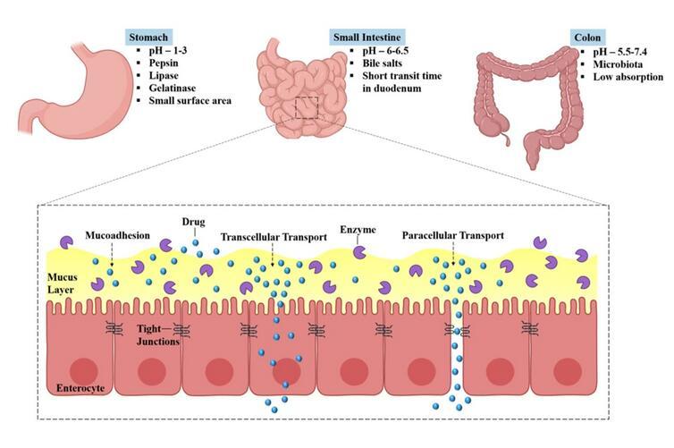 口服藥物在經(jīng)歷胃部的生理障礙后到達小腸。在小腸(十二指腸)的入口處,胰酶會引發(fā)幾種酶促轉(zhuǎn)化,這些酶還可能導(dǎo)致首過代謝,從而導(dǎo)致藥物生物利用度降低。因此,口服藥物必須克服這些生理學障礙。