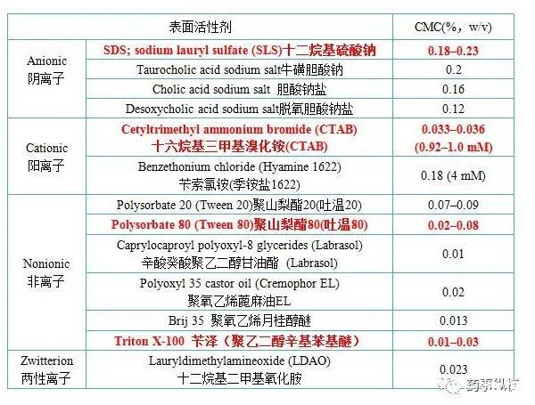 常見表面活性劑的種類及臨界膠束濃度