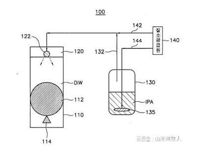 參照圖3,在所述引擎蓋的底面上形成了用于破斷移至所述殼體上部的晶片的系合槽。所述系合槽用于使已完成干燥工藝的晶片與所述殼體分離;該小定位置形成了一個噴射孔,該噴射孔將從上述散裂器噴射的異丙基醇蒸氣引導(dǎo)到上述殼體內(nèi)。