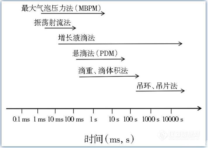 由于對DST時間范圍界定的不同,可運用的測量手段也有所不同。王建坤等認(rèn)為,在達到靜態(tài)表面張力前的表面張力變化都可算是DST,這個時間范圍以幾毫秒到幾小時計。可用Wilhelmy吊片法、DuNouy吊環(huán)法、滴重法、滴體積法、懸滴法、最大氣泡壓力法測定DST。