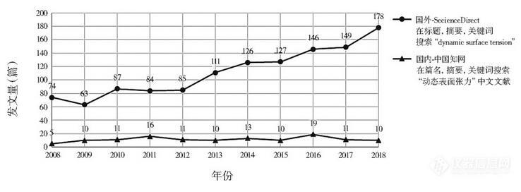 當(dāng)研究的液體吸附過程在快速、持續(xù)進行,且短時間內(nèi)無法達到平衡時,對液體DST的研究比靜態(tài)表面張力更有意義。如在農(nóng)藥噴灑、噴墨印刷、織物快速潤濕,以及攝影用薄膠片制備中。圖1對比了近10年(2008~2018年)國內(nèi)外發(fā)表的以DST為主要考察項的論文數(shù)。數(shù)據(jù)顯示國內(nèi)在DST方面的研究較少且總體波動不大,而國外則呈持續(xù)上升趨勢。