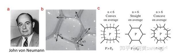 比如,依據(jù)Plateau第一定律,可以推出,相鄰三個(gè)相互接觸的氣泡的三條邊界上的曲率之和為零(Curvature sum rule)。其中最重要地是1952年von Neumann利用它推導(dǎo)出了二維泡沫的演變方程(Ref 3)。