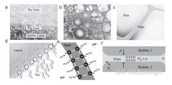 圖1.不同尺度下的泡沫結(jié)構(gòu)及穩(wěn)定機(jī)制(Ref 1)(a)整個(gè)泡沫結(jié)構(gòu),尺度為0.01 m至1 m。(b)干泡沫的放大部分,尺度為0.1 mm至1 cm。(c)液體通道,也叫Plateau邊界,尺度為1 um至0.1 mm以及肥皂泡膜,尺度為10 nm到1 um。(d)氣液界面的分子層結(jié)構(gòu),尺度為0.1 nm到10 nm。e-f)氣泡膜在界面靜電力排斥作用即楔裂壓(disjoining pressure)的作用下而穩(wěn)定存在。