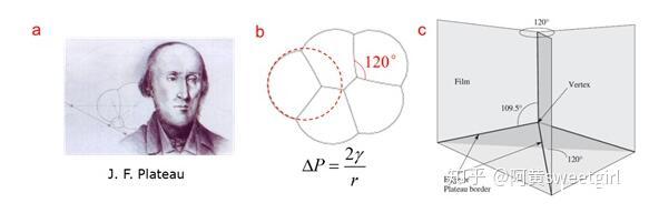 泡沫物理學(xué)集中于研究泡沫的結(jié)構(gòu)、靜力學(xué)、動(dòng)態(tài)演變及排液等內(nèi)容。它是一個(gè)十分古老的學(xué)科,由比利時(shí)物理學(xué)家Plateau在19世紀(jì)中葉開(kāi)創(chuàng)(圖2a)。Plateau在數(shù)十年的失明的時(shí)光里,依舊通過(guò)指導(dǎo)他侄子做試驗(yàn),堅(jiān)持研究肥皂泡薄膜的幾何形態(tài)及其背后隱藏的力學(xué)規(guī)律。1873年,他和侄子把自己的實(shí)驗(yàn)現(xiàn)象和分析結(jié)果做了系統(tǒng)整理,以法文發(fā)表,從此把對(duì)泡沫結(jié)構(gòu)的研究由定性印象推到了量化階段,開(kāi)創(chuàng)了泡沫物理學(xué)(Ref 2)。在泡沫靜力學(xué)方面,Plateau的主要貢獻(xiàn)在于其提出了干泡沫的靜態(tài)結(jié)構(gòu)力學(xué)的三定律,它是后續(xù)泡沫研究的基石: