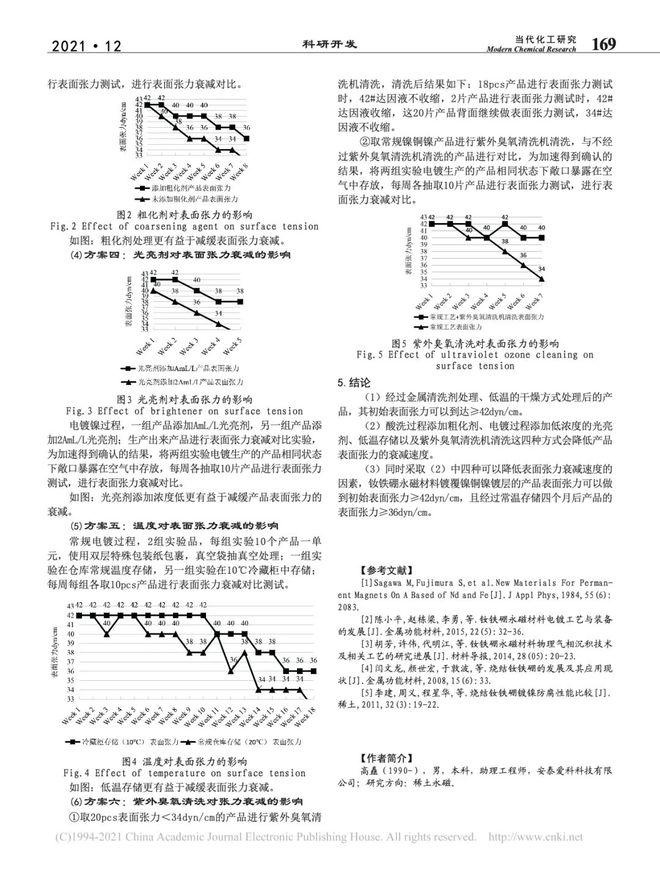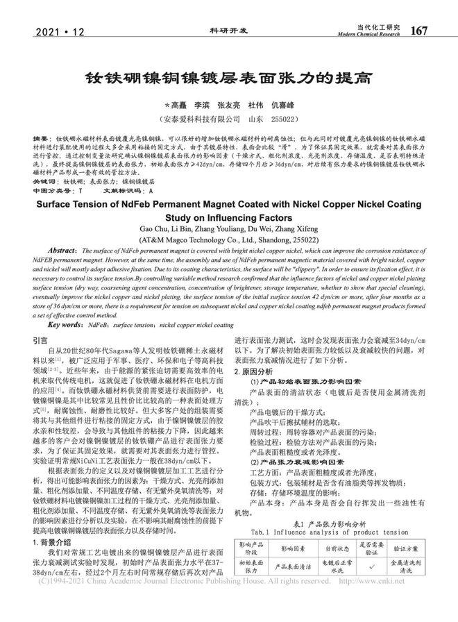 摘要:釹鐵硼永磁材料表面鍍覆光亮鎳銅鎳,可以很好的增加釹鐵硼永磁材料的耐腐蝕性;但與此同時對鍍覆光亮鎳銅鎳的釹鐵硼永磁材料進行裝配使用的過程大多會采用粘接的固定方式,由于其鍍層特性,表面會比較"滑",為了保證其固定效果,就需要對其表面張力進行管控。通過控制變量法研究確認鎳銅鎳鍍層表面張力的影響因素(干燥方式、粗化劑濃度、光亮劑濃度、存儲溫度、是否表明特殊清洗),最終提高鎳銅鎳鍍層的表面張力,初始表面張力≥42dyn/cm,存儲四個月后≥36dyn/cm,對后續有張力要求的鎳銅鎳鍍層釹鐵硼永磁材料產品形成一套有效的管控方法。