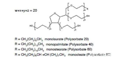 吐溫(Tween或polysorbate)也是一類較為常用的非離子表面活性劑。脫水山梨醇作為中心結構,四條PEG鏈段的一端連接在中心單元上。其中一條PEG鏈段的末尾連接脂肪長鏈。吐溫常見的型號一般為吐溫20、吐溫40、吐溫、60和吐溫80,這些表面活性劑中,PEG的重復單元數目總數為20,而PEG末端連接脂肪酸長鏈包括月桂酸、棕櫚酸、硬脂酸和油酸。隨著脂肪鏈長度的增加,疏水結構的占比增加,HLB下降,但是吐溫是水溶性表面活性劑,這幾個吐溫的HLB通常都在15以上。吐溫通常用于微乳、自乳化系統和固體分散體中。如果將吐溫中的PEG鏈段去除或替換成脂肪長鏈,則得到了另一類表面活性劑,司盤。這是一類非水溶性表面活性劑,HLB通常小于10。