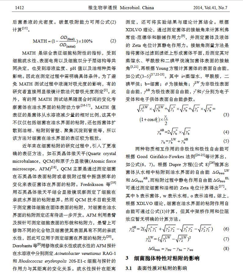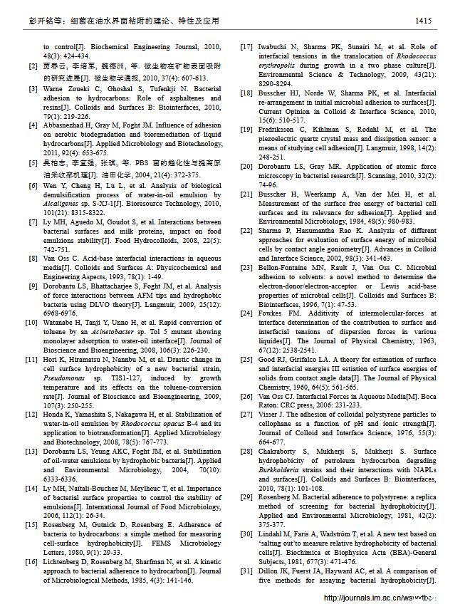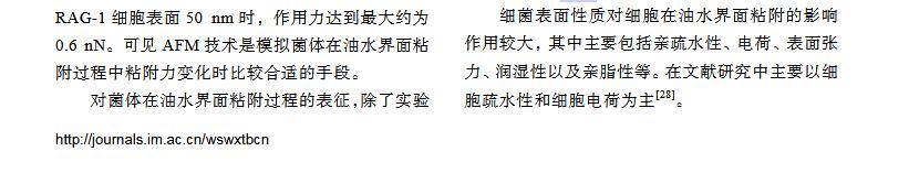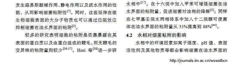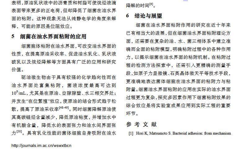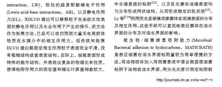 摘 要:細菌在油水界面粘附主要應用于烷烴污染的環境修復、石油開采與加工、食品加工等方面,其研究已經引起各界的廣泛關注。本文基于 XDLVO 理論闡述細菌在油水界面的粘附機理;總結細菌表面特性、油相及水相性質對細菌粘附的影響;介紹細菌粘附作用在微生物驅油、生物乳化與破乳以及烷烴降解方面的應用,并對今后的研究方向提出展望。