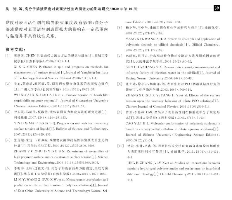 為了揭示高分子溶液黏度對表面活性劑表面張力的影響程度及規律,利用全自動張力儀,通過Wilhelmy吊片法測定了4種表面活性劑(SDS、SDBS、油酸鈉、OP-10)水溶液的臨界膠束濃度以及加入不同黏度高分子(羧甲基纖維素、多元醇聚合物)溶液前后的表面張力。結果表明:加入不同黏度高分子溶液后,4種表面活性劑的臨界膠束濃度并沒有發生變化,但臨界膠束濃度對應的表面張力均有小幅提升,且高分子溶液黏度對表面活性劑表面張力的影響在一定范圍內與黏度并無明顯的線性關系;在加入黏度為14 mPa·s的羧甲基纖維素溶液后,SDS、SDBS、油酸鈉、OP-10在臨界膠束濃度對應的表面張力分別為36.60 mN·m~(-1)、40.06 mN·m~(-1)、54.30 mN·m~(-1)、44.05 mN·m~(-1)。