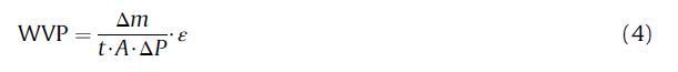 其中WVP=水蒸氣滲透率,單位g mm m-2次方h-1次方Pa-1次方;ε=厚度mm;m=質量隨時間的變化,單位為g;t=h中的時間;A=薄膜面積,m2;和DP=杯內薄膜表面的校正水蒸汽分壓e柜內薄膜外表面的水蒸汽分壓。