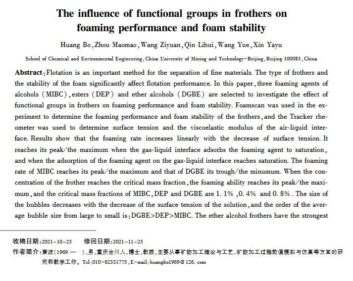 【摘要】:浮選是分離微細物料的重要方法,起泡劑類型和泡沫穩定性顯著影響浮選效果。本文選取醇類(MIBC)、酯類(DEP)和醚醇類(DGBE)三種起泡劑,通過實驗研究官能團對起泡性能和泡沫穩定性的影響。實驗用Foamscan測定起泡劑溶液的起泡性能和泡沫穩定性,用Tracker流變儀測定表面張力和氣液界面黏彈模量。研究結果表明:起泡速率隨表面張力的減小呈線性增大,當氣液界面吸附起泡劑達到飽和時起泡速率最大,其中MIBC的起泡速率最高,DGBE最小;起泡劑濃度為臨界質量分數時,起泡能力最大,MIBC、DEP和DGBE的臨界質量分數分別為1.1%、0.4%和0.8%;氣泡的大小隨溶液表面張力減小而減小,氣泡平均尺寸由大至小順序為:DGBEDEPMIBC;在泡沫穩定性方面,醚醇類起泡劑最強,醇類起泡劑最差,同時MIBC、DEP和DGBE質量分數分別為0.4%、0.5%和0.8%時,起泡劑生成的泡沫最穩定。