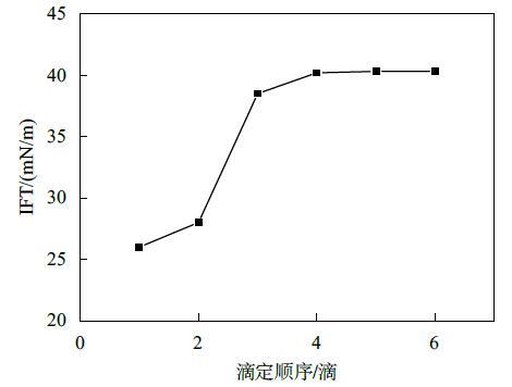 結(jié)果表明,液滴懸置5 min后,第一滴液滴表面張力值最小,隨著連續(xù)滴定的進行,液滴表面張力值逐漸增大,最終趨于平衡。究其原因,可能是由于懸置一段時間后,表面活性劑分子在表面充分吸附,所以第一滴液滴表面張力最小,而隨著連續(xù)滴定進行,由于平衡時間較短,表面活性劑分子在液滴的表面吸附未達平衡,所以數(shù)值逐漸增大,然而滴加液滴的速度一定,表面活性劑分子在表面的遷移速率一定,降低表面的能力與效率一定,最終會達到一個穩(wěn)定值。而平衡時間的長短,與表面活性劑分子的性質(zhì)有關(guān),遷移吸附速率快的表面活性劑分子所需時間較短。由此可見,使用懸滴法測定表面張力時,時間效應(yīng)的影響不可忽略。