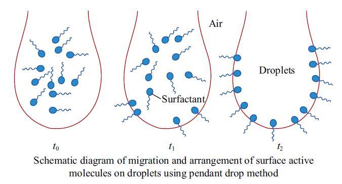 結(jié)果表明,在動態(tài)表面張力曲線圖中,A,B,C三種樣品在60 mg/kg的較低含量下,表面張力均呈現(xiàn)先快速降低而后緩慢降低最終達到平衡的趨勢,表明表面活性劑分子在液滴表面上確實存在著隨時間變化逐漸吸附平衡,排列完整的現(xiàn)象,如圖4所示,表面活性劑分子在表面完全吸附、排列緊密需要一定的時間,顯然在使用懸滴法進行測定時,時間效應(yīng)直接影響著表面張力測定的誤差大小,符合前文所述結(jié)論。而樣品B在100 mg/kg含量下,動態(tài)表面張力趨勢圖成一條直線,證明該種表面活性劑在液滴表面遷移速度較快,在液滴完全注射形成之前已快速到達平衡狀態(tài),表面活性劑分子在表面得以充分排布,這解釋了較低含量的表面活性劑溶液的靜態(tài)表面張力與國標推薦方法吻合程度差異較大的原因。這是由表面活性劑分子自身性質(zhì)所決定的,與其極性基的類型、結(jié)構(gòu)、個數(shù)、疏水基長度等息息相關(guān)。而單一液體,未具有含量差,故不存在表面活性劑分子從溶劑內(nèi)部遷移吸附至表面這一過程,所以其動態(tài)表面張力曲線呈現(xiàn)為平穩(wěn)直線。