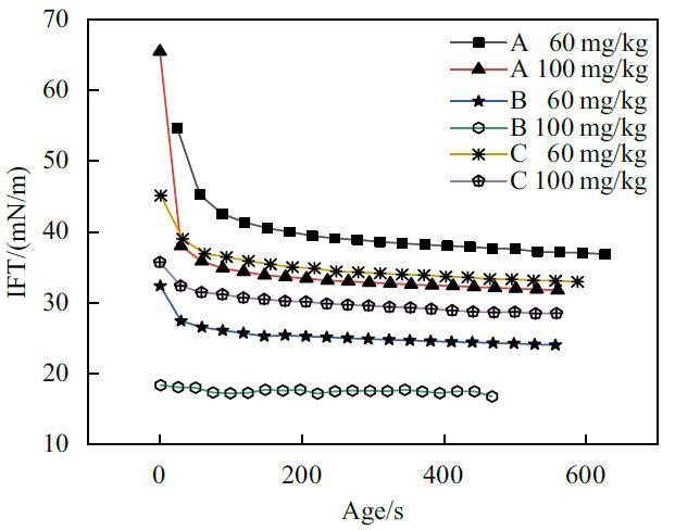 為了充分證明時間效應(yīng)對懸滴法測定結(jié)果會造成影響,實驗使用懸滴法對A,B,C三種表面活性劑復配溶液較稀含量下的動態(tài)表面張力進行了研究。結(jié)果如圖3所示。