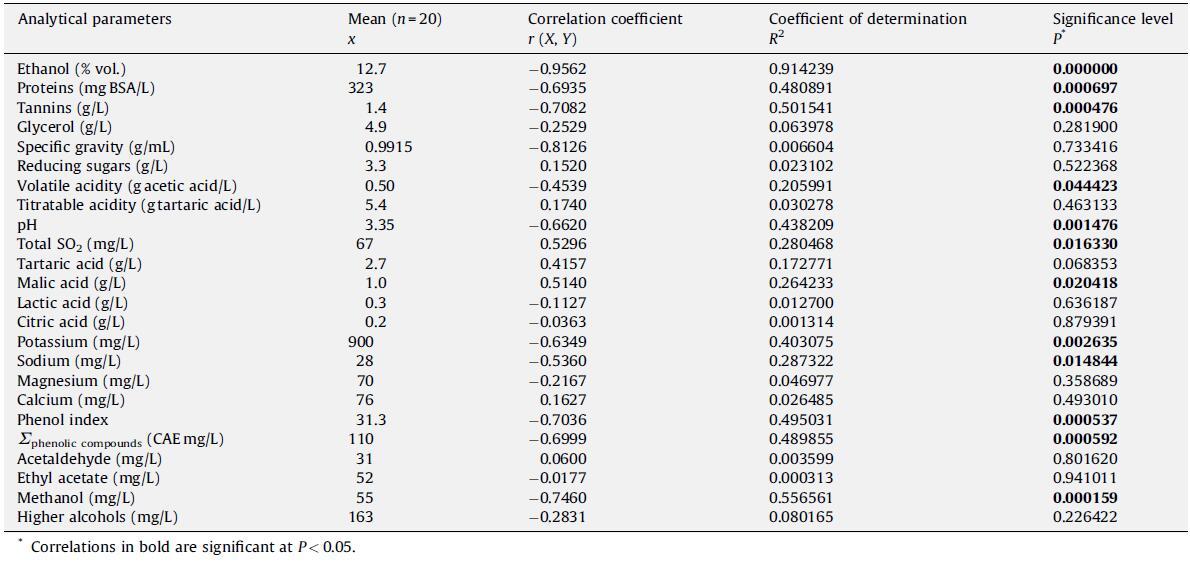 統計分析顯示,在檢查的 24 個分析參數中,有 12 個與表面張力顯著相關(P < 0.05)(表 4)。 其中有 10 個(乙醇、蛋白質、單寧、揮發性酸度、pH、鉀、鈉、甲醇和總酚——280 nm 吸光度和 HPLC 測定)具有負相關系數,表明它們與表面張力成反比,較高的它們的值,樣品的表面張力越低。 另外兩個(蘋果酸和總 SO2)具有正相關系數。 測量的最小 P 值 (P = 0.000000) 對應于乙醇,第二小 (P = 0.000476) 對應于單寧,表明這兩個參數與表面張力的相關性最好。 不出所料,還原糖和比重根本沒有關聯,因為糖分子表現出高水溶性并且幾乎沒有表面活性。