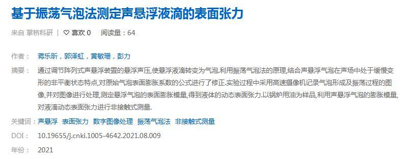 以鍋爐用油為樣品,利用聲懸浮氣泡的膨脹模量,對(duì)液滴動(dòng)態(tài)表面張力進(jìn)行非接觸式測量。